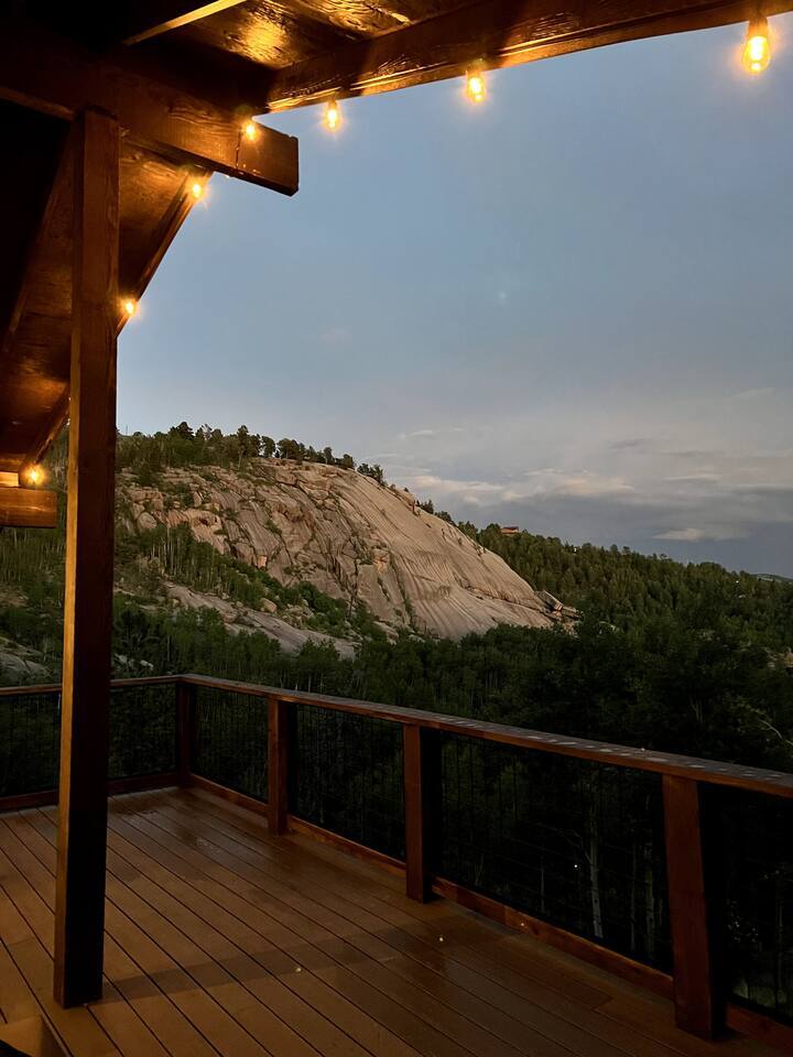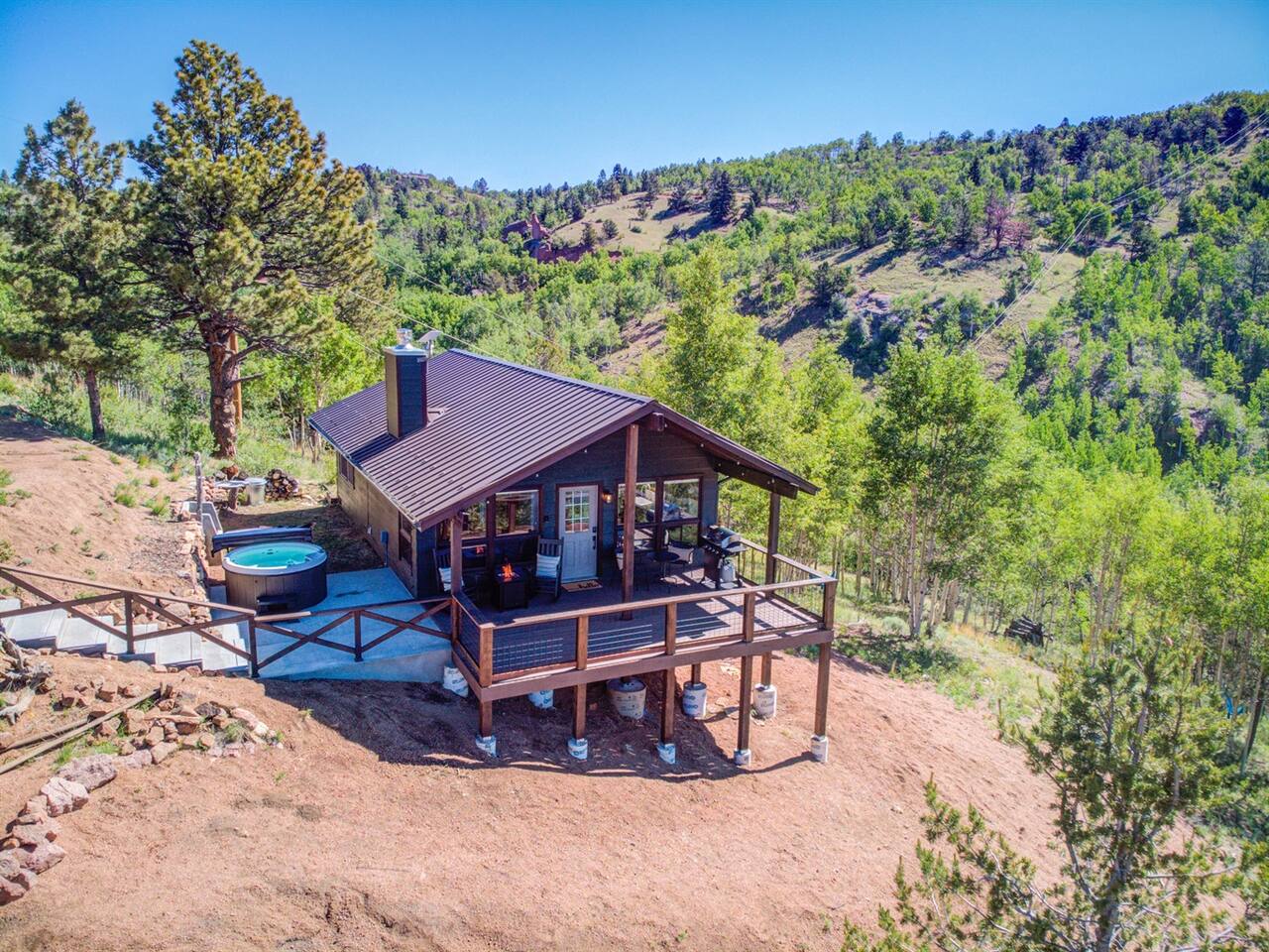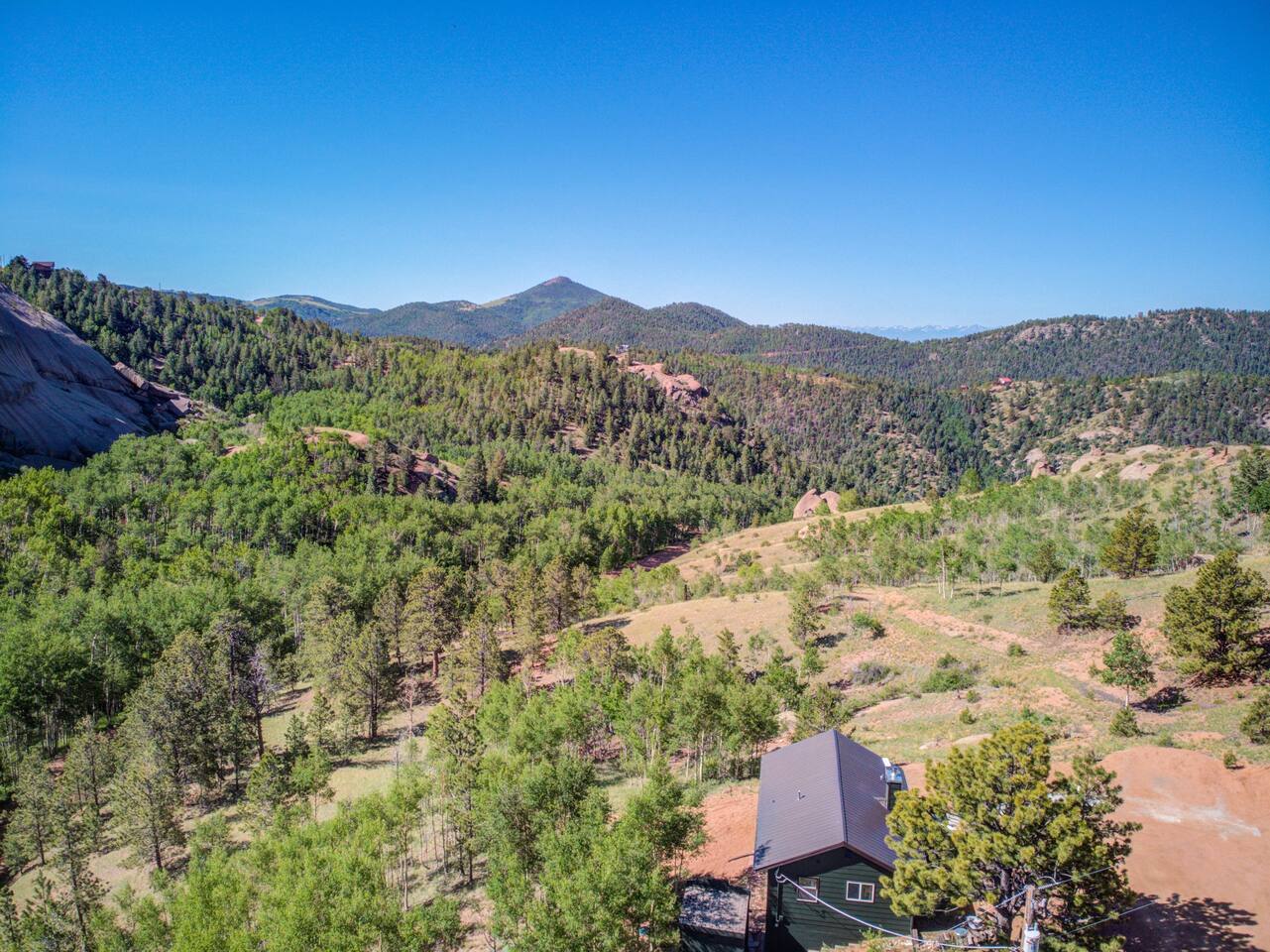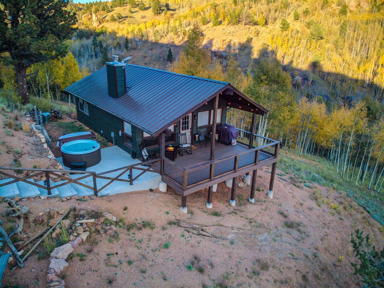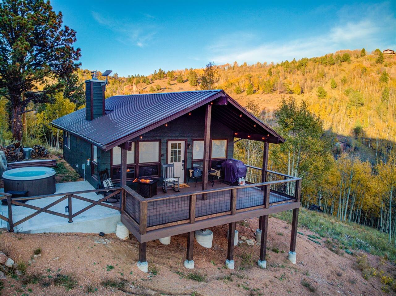 Escape to our modern cabin in the Pikes Peak region. Enjoy mountain views, a hot tub, and a large deck surrounded by aspen and pine trees. This private property has been newly renovated and boasts a large flatscreen TV and high-speed Starlink internet. Experience the magic of nature as you spot big horn sheep and other wildlife. Relax by the fire pit under a starlit sky. With its serene ambiance and new renovations, this property offers the perfect mountain getaway.