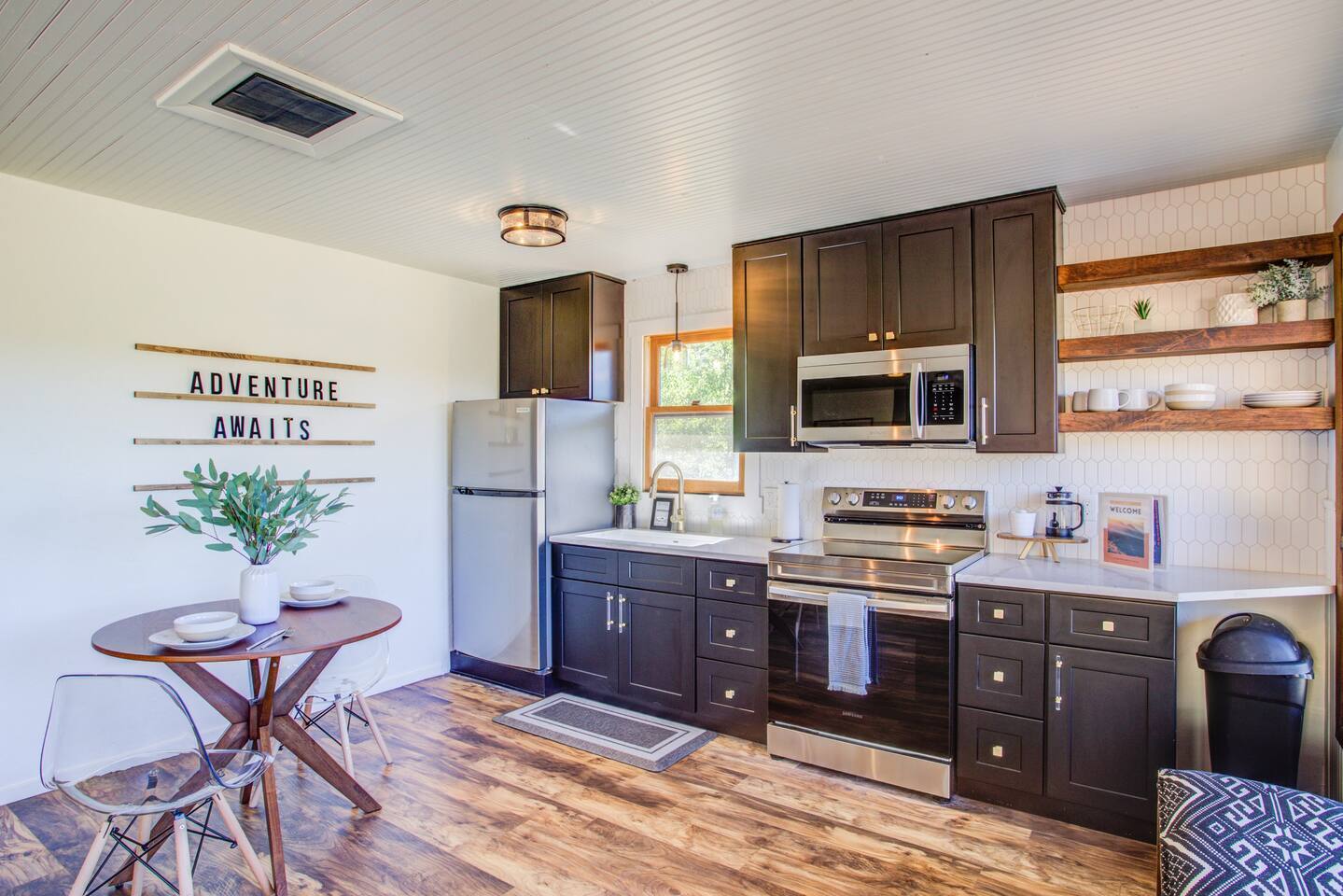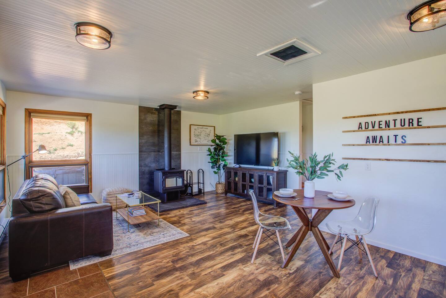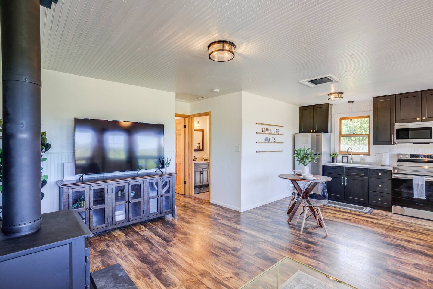 Step inside the cabin and be greeted by a recently renovated interior that seamlessly blends rustic charm with modern comforts. The open and spacious layout provides an inviting atmosphere for relaxation and socializing. Relax is the cozy living area, where large windows frame the majestic mountains, allowing natural light to flood the space. For entertainment, a large flatscreen TV awaits, ensuring you never miss your favorite shows or movies. The kitchen has anything you may need to cook up a quick snack or a large meal. There is tremendous views from every window as you walk through the cabin. You will find a central bathroom with an extra large shower, big vanity and a full sized washer and dryer. Then you will enter into the large bedroom in the back of the cabin. It is set with a memory foam king bed. There is a comfy office chair and a large desk equipped with a charging station and Starlink Internet for all your remote working needs! The exterior of the cabin has a large deck, hammocks and plenty of spots to take on your next book.