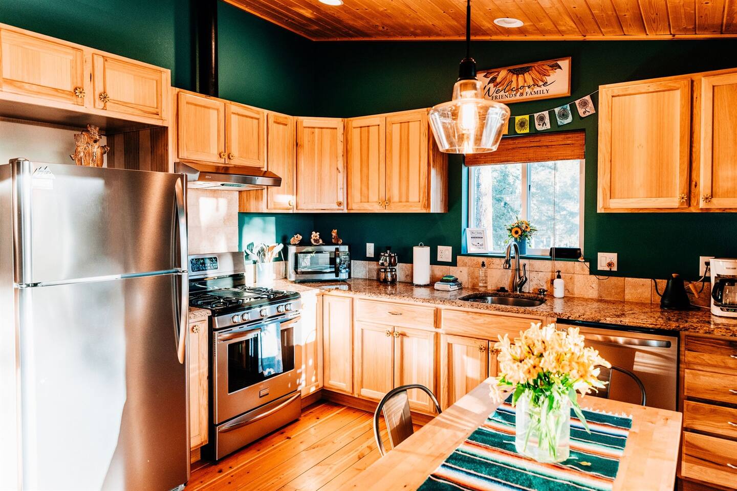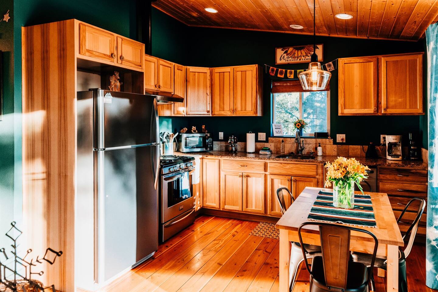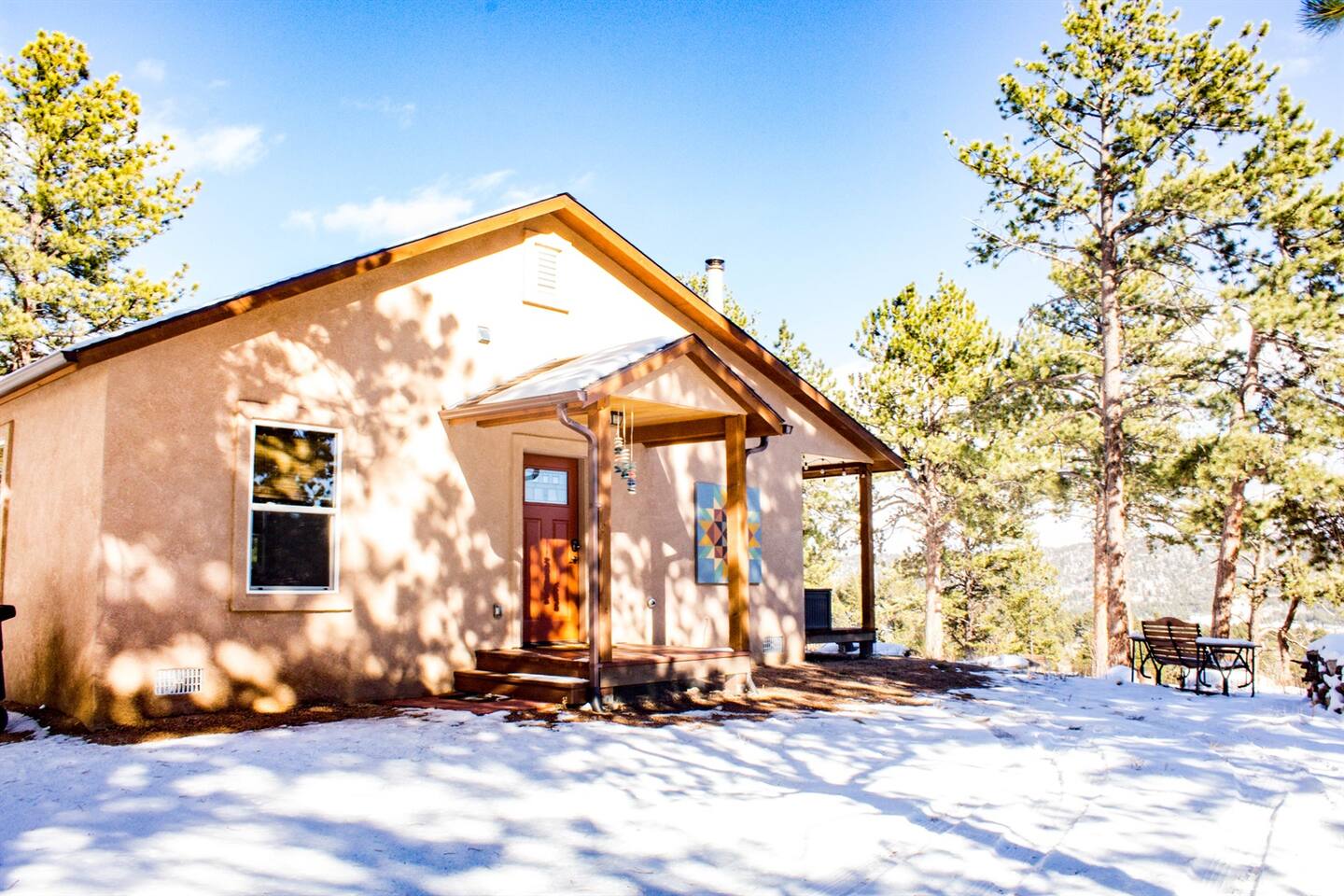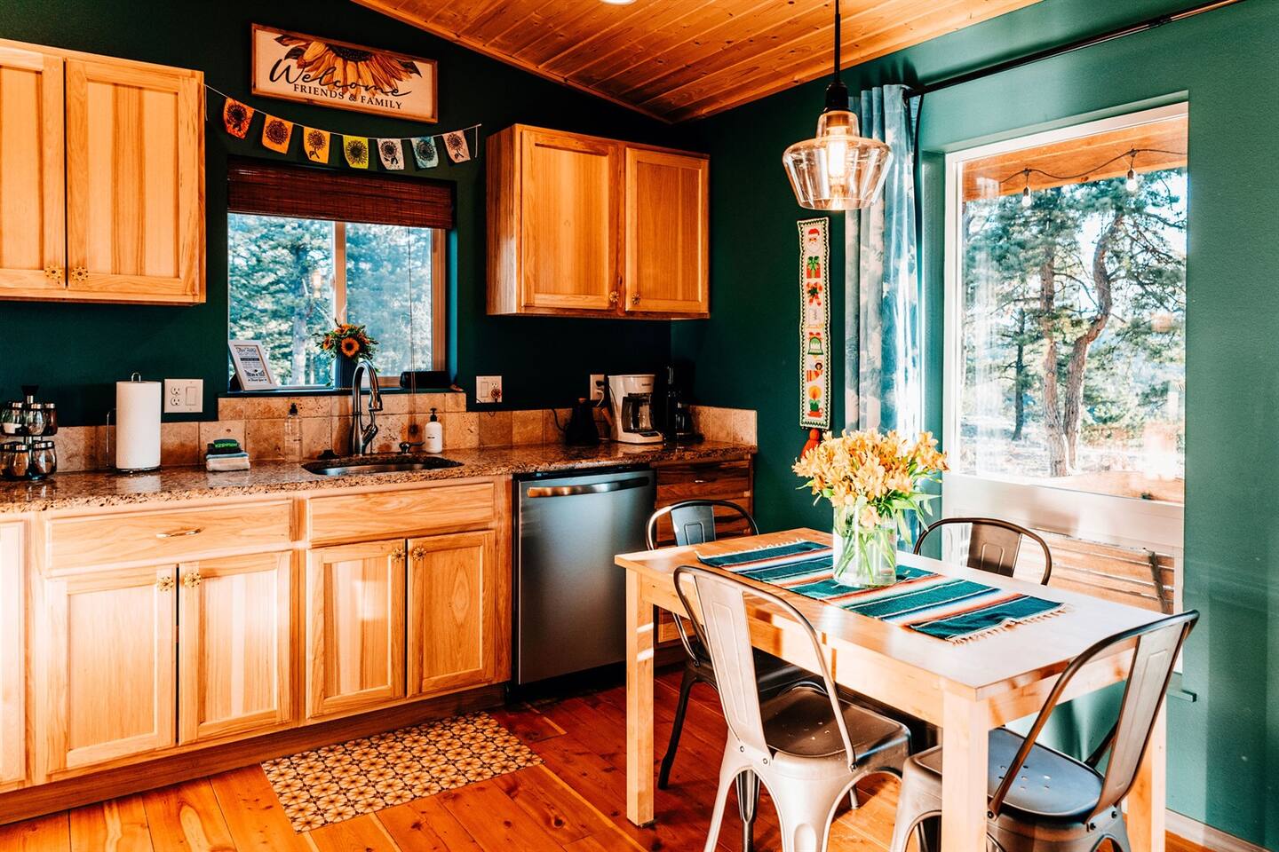 Welcome to Sunflower Cabin, your mountain home away from home! It is our favorite place in the world and we are excited to share it with you. We strive to have everything you’ll possibly need for a comfortable stay, including these amenities: KITCHEN - Granite countertops - Stainless steel appliances - Gas stove - Microwave - Refrigerator + freezer - Locally-roasted coffee beans provided (plus grinder, pour-over, and drip machine) - Plenty of pots, pans, dishes, and utensils LIVING + DINING - Large windows with views of Pikes Peak - Reliable high-speed internet - Smart TV with streaming capabilities - Wood stove with plenty of firewood and fire-starting supplies - Dining table comfortably seats 4 - Puzzles and games are on the shelf beneath the TV KING BEDROOM - King sized bed - Snooz white noise machine - Space heaters, fans, extra blankets in closet - Dog bed and wire kennel are stored underneath the bed QUEEN BEDROOM - Queen sized bed - Twin trundle bed stored underneath - Snooz white noise machine - Washer and dryer in closet OUTDOORS - Private hot tub with views of Pikes Peak – comfortably seats 4 (officially a 7-person tub, iykyk). - Picnic table - 2 comfy Adirondack-style chairs on back porch - Propane grill - Frisbee golf We are operating in Park County under permit 24-0219-01