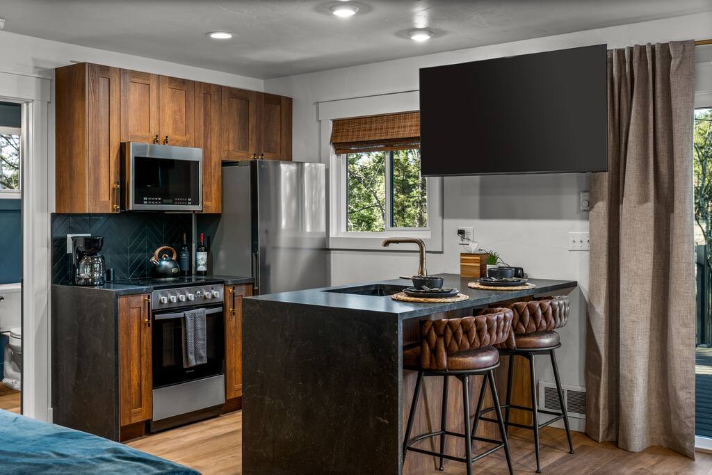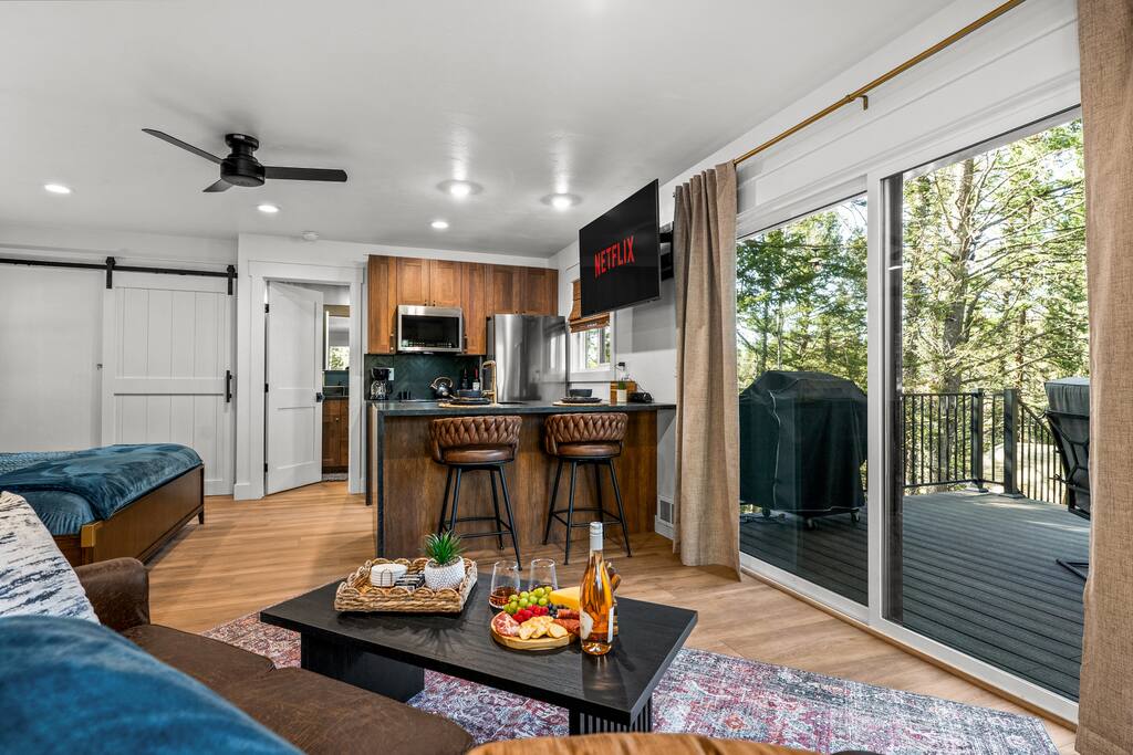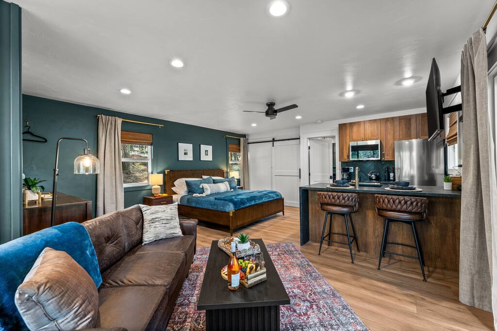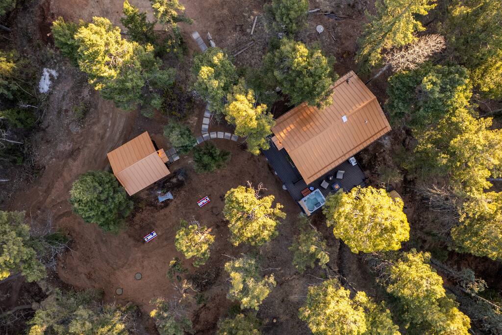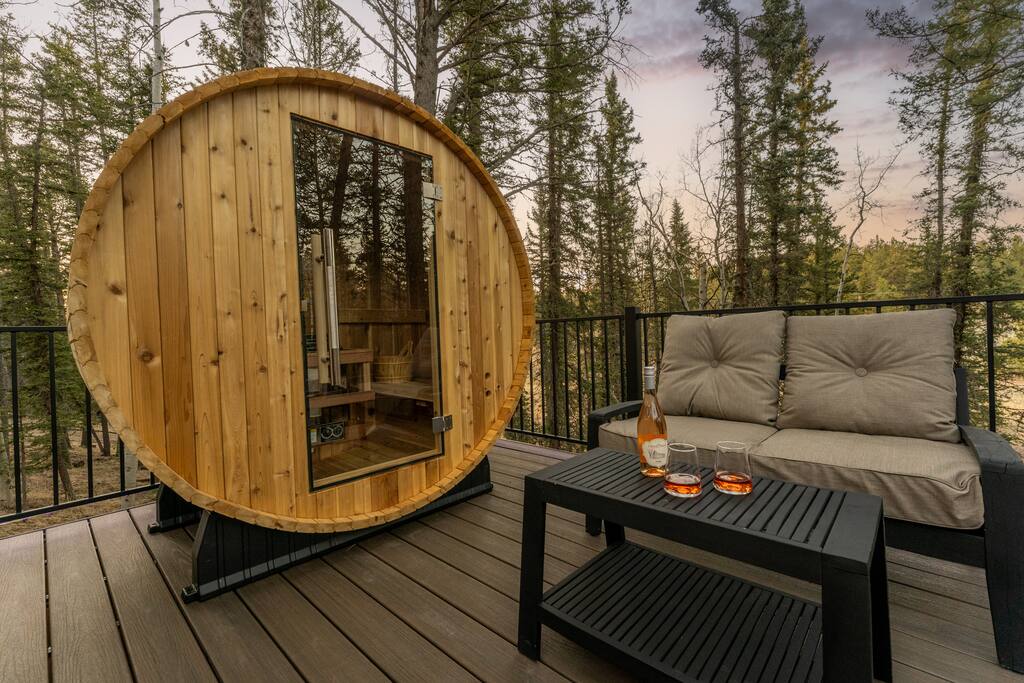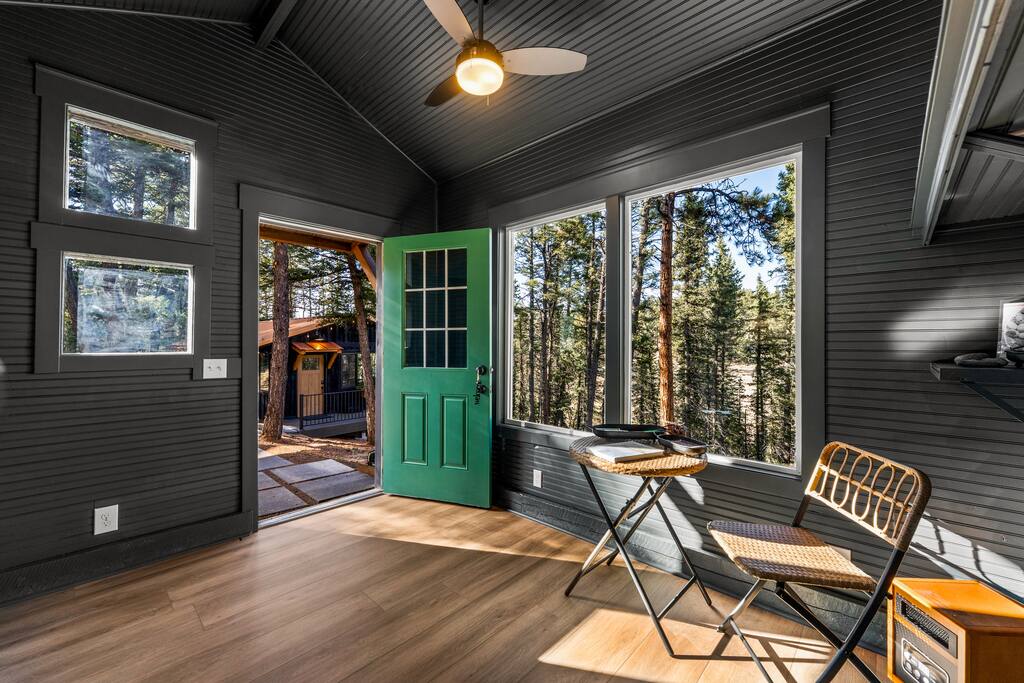 Welcome to your peaceful retreat in the pines—a fully custom studio cabin nestled at the very end of a quiet cul-de-sac in Florissant, Colorado. Surrounded by nature and thoughtfully designed for comfort, creativity, and relaxation, this secluded escape is ideal for couples, solo travelers, or anyone craving a deep breath of fresh mountain air. Inside, the open-concept studio features a luxurious king-size bed with soft, hotel-quality linens, a cozy sitting area, and a fully equipped kitchen with everything you need to prepare meals during your stay. Whether you’re cooking a romantic dinner or simply enjoying a quiet morning coffee, the space is set up to feel like home—only better. The modern bathroom offers spa-like touches, including a rainfall showerhead and a heated towel rack. Every detail has been carefully considered to make your stay both comfortable and memorable. Step outside onto your private multi-level deck, where the amenities truly shine. Soak in the hot tub under the stars, relax in the barrel sauna, fire up the grill for dinner, or gather around the fire pit with a glass of wine. Whether it's adventure or stillness you seek, this space allows for both. In addition to the main cabin, guests have access to a separate studio space—a bright, open area perfect for yoga, meditation, writing, or painting. We have mats provided, some sketching materials, and a relaxing space to get your creativity flowing - or bring what you wish and make this space your own. As part of a designated Dark Sky Community, this property offers breathtaking views of the night sky with minimal light pollution. After sunset, look up—you’ll be treated to an amazing display of stars that feels truly otherworldly. It’s the perfect end to a perfect day in the woods. Located near hiking, wildlife, and stargazing opportunities, this is a true Colorado hideaway built for rest, creativity, and connection with nature and yourself.