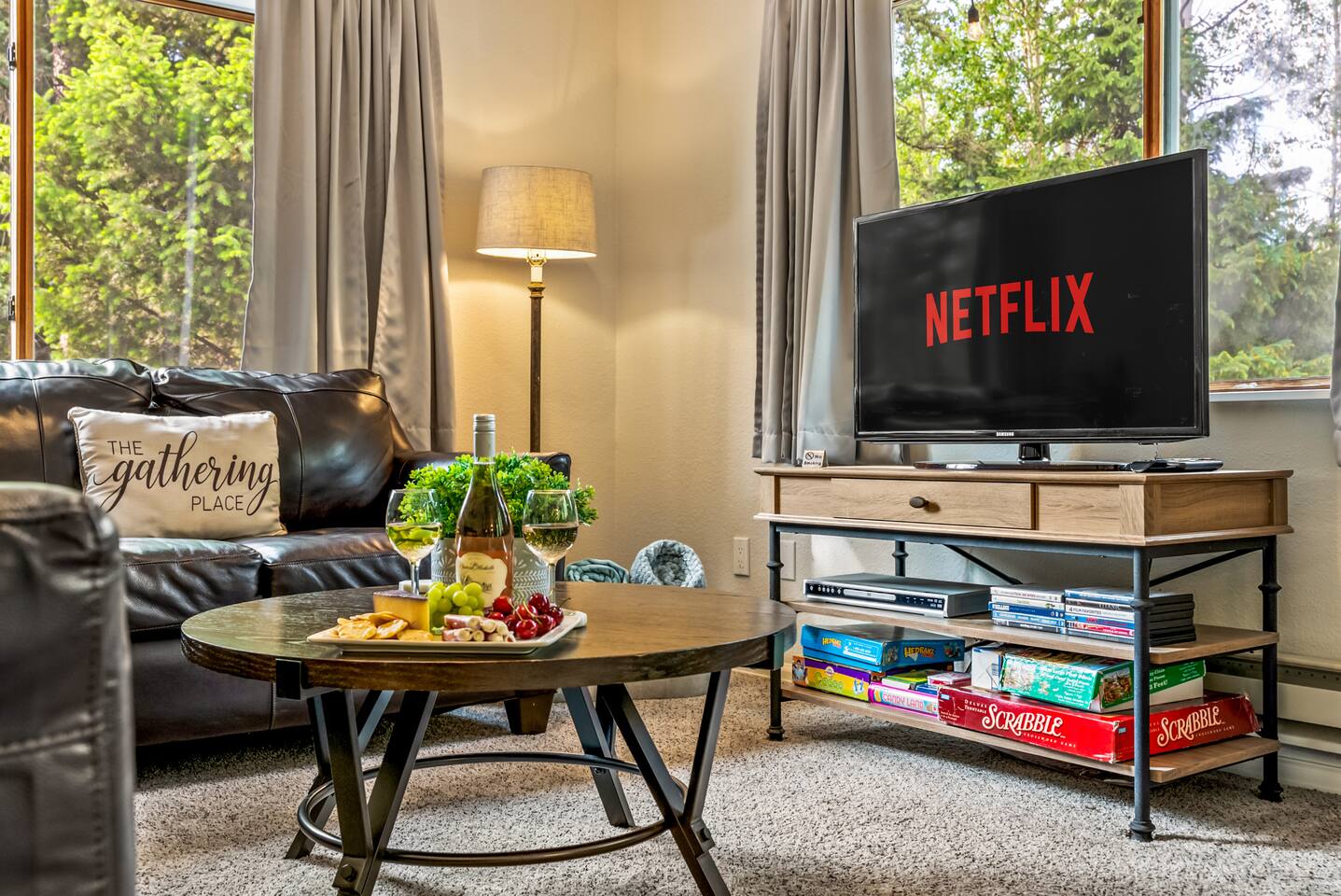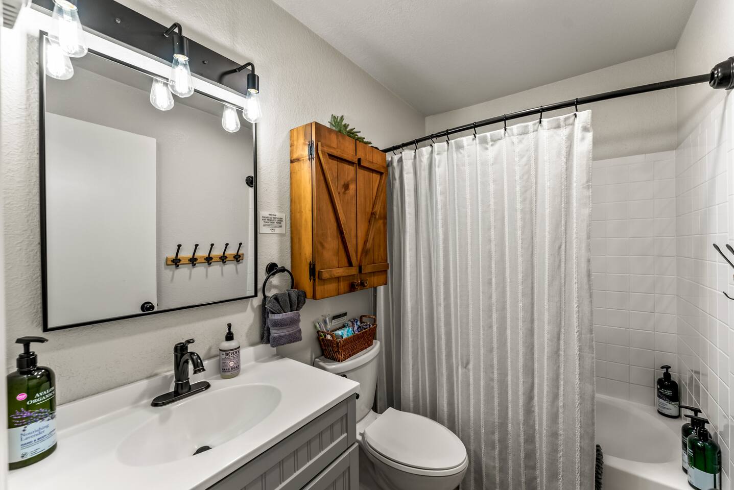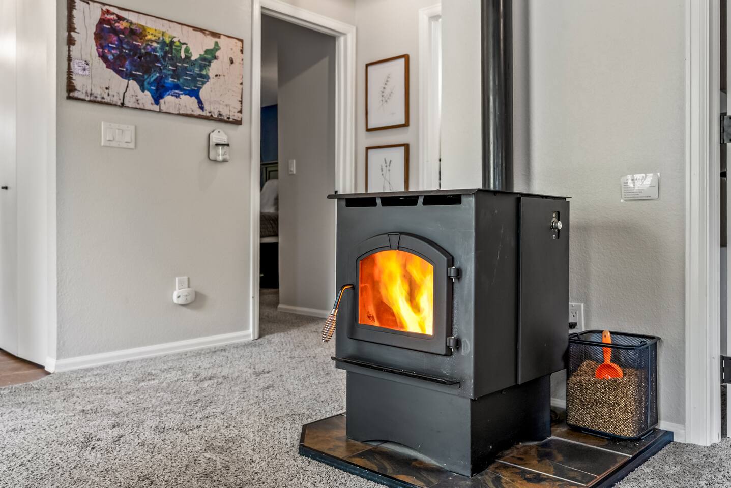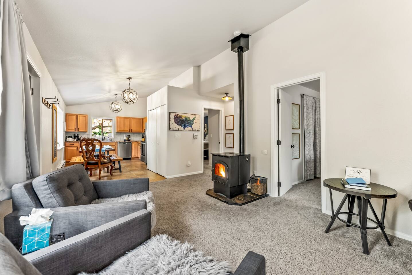 As you arrive at this charming woodland cabin, you’re immediately welcomed by the peaceful sights and sounds of nature. Tucked beneath a canopy of towering pines, the outdoor space is thoughtfully designed to help you unwind and reconnect with the great outdoors. Step onto the spacious patio, where you’ll find comfortable lounge furniture perfect for relaxing with a morning coffee or an evening drink. A dining table with plenty of seating invites you to enjoy meals outside, whether it's a casual brunch or a cozy dinner under the stars. Nearby, a private hot tub awaits — bubbling and ready for a long soak after a day of adventure. As night falls, gather around the fire pit, surrounded by nature, to roast marshmallows, share stories, or simply stargaze in the clear, open sky. The surrounding woods create a sense of seclusion and peace, while still keeping you close to local amenities. Entering the cabin, you'll find a warm and inviting living room. A pellet stove sits in the heart of the space, offering the perfect ambiance for chilly mountain evenings. Plush seating and tasteful rustic decor make it easy to settle in and relax, whether you're reading a book, playing games, or watching your favorite show. The open-concept layout seamlessly connects the living area to the fully stocked kitchen. Whether you're whipping up a hearty breakfast or a gourmet dinner, you’ll find everything you need — cookware, dishes, utensils, and modern appliances — to make dining in a breeze. The kitchen island offers extra prep space and is a great spot for a casual meal or morning chat over coffee. Conveniently located in the center of the cabin are laundry facilities, allowing you to pack light and stay fresh during longer stays. The cabin offers one bathroom, complete with a full shower and tub combination — perfect for rinsing off after a long hike or indulging in a relaxing soak. When it’s time to turn in, two cozy bedrooms offer restful retreats. The first bedroom features a luxurious king bed, draped in soft linens and set against a backdrop of calming colors and rustic touches. The second bedroom is spacious and well-suited for families or groups, with two comfortable queen beds and plenty of space to spread out. Designed with families in mind, the cabin is stocked with thoughtful extras to make traveling with little ones easier. You'll find a baby backpack carrier for outdoor adventures, a pack 'n play for restful naps and nights, and a collection of toys and games to keep kids entertained indoors. Board games and puzzles are also available for family game nights around the fire. Whether you’re looking for outdoor adventures, a quiet retreat, or quality time with loved ones, this beautiful cabin offers the perfect setting. With nature all around you, family-friendly amenities, modern comforts, and thoughtful details throughout, your stay promises to be as comfortable as it is memorable.